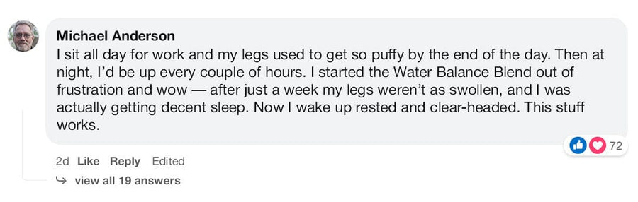 "My doctor had me on prescription water pills which just made me pee constantly ALL DAY. I was tethered to bathrooms 24/7. Switched to Water Balance Blend and the difference is night and day. It regulates things naturally—I'm not running to the bathroom during the day, but I'm also not waking up 6 times at night anymore. My legs don't swell like they used to, and I have way more energy. Plus I'm not depleting all my minerals like I was with the prescription stuff."
