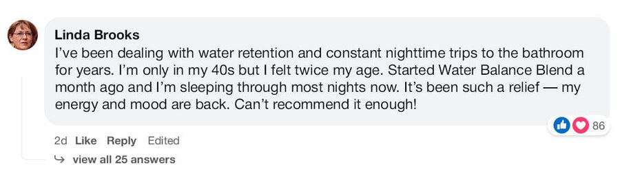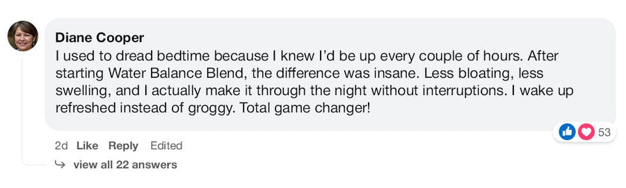 I was skeptical but desperate after years of waking up 4-5 times nightly. Started Water Balance Blend and by week 3 I was down to 1-2 times. Week 5, I slept until my alarm. I cried. I forgot what it felt like to wake up rested. Game changer.